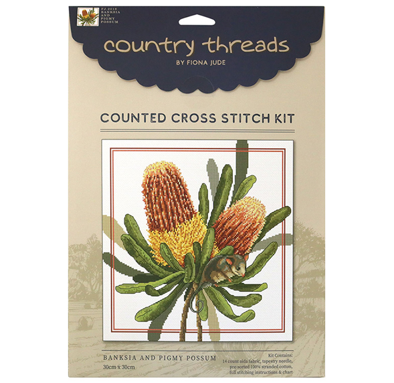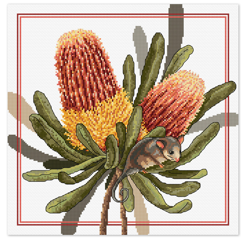 FIONA JUDE - Country Thread Cross Stitch - banksia and pigmy possum 30 cms x 30cm