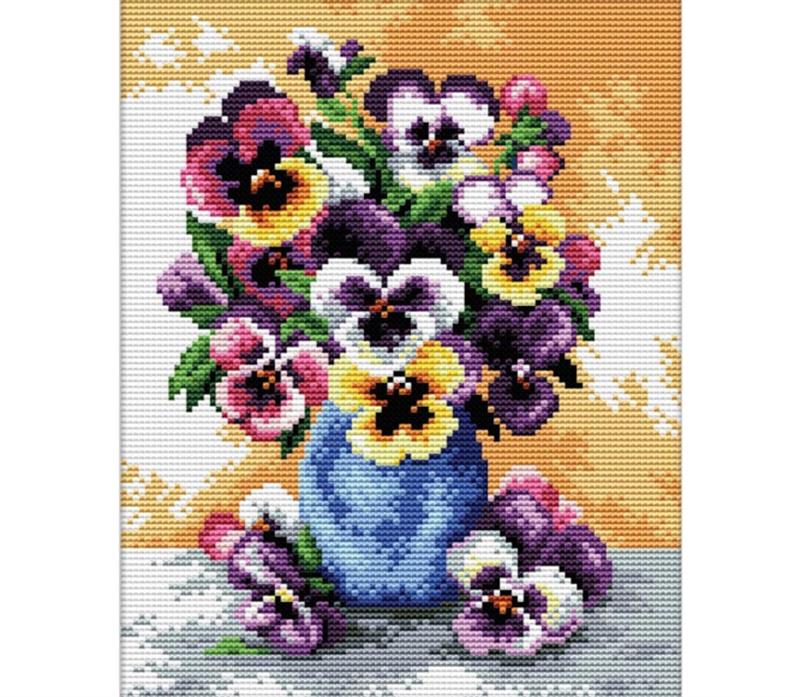 No Count Cross Stitch On White Aida 14 - vase of pansies 17 x 22cm